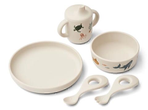 Une combinaison de pièces durableset essentielles pour le repas, comprenant la fourchette Liva, la cuillère Liva, le gobelet Neil, le bol Iggy et l’assiette Olivia.