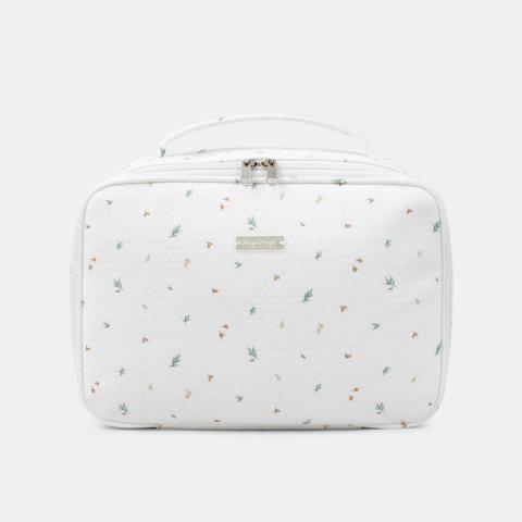 Pour les parents organisés, adaptée au printemps. Valise en tubique fantaisie avec doublure en fourrure synthétique, fermeture zippée. Imprimé feuillage beige, caramel et bleu, style pratique et poétique. En tubique fantaisie Imprimé feuillage dans les tons beige, caramel et bleu sur fond écru Doublure en fourrure synt