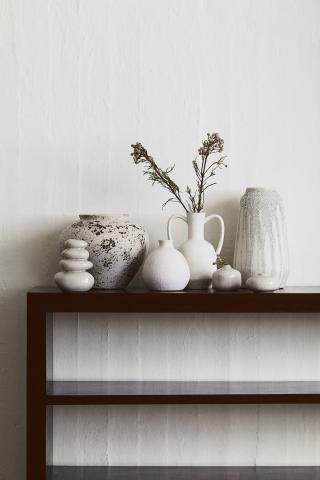 Vase texturé en terracotta émaillée. Modèle agrémenté de poignées délicates. Diamètre de l'ouverture 6 cm. Diamètre au point le plus large 14 cm. Hauteur 24 cm.
