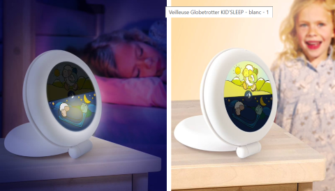 Idéale pour les voyages, la veilleuse Kid’Sleep Globetrotter est une veilleuse indicatrice de réveil qui permet à l'enfant de savoir se repérer dans la nuit, même sans savoir lire l'heure. C'est très simple, grâce aux boutons et l'écran LCD du Kid'Sleep Globetrotter, les parents règlent l'heure de réveil de l'enfant. Pendant la nuit, lorsque le mouton dort, l'enfant sais qu'il est encore l'heure de dormir. A l'heure réglée par les parents, le mouton passe silencieusement en position réveillée. L'enfant sait qu'il peut se lever. Avec l'option "alarme", le petit mouton se lève en musique. Son petit format très pratique fait du Kid’Sleep Globetrotter un compagnon de voyage idéal.
