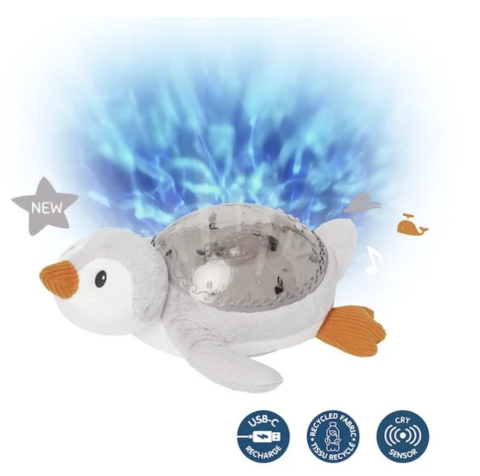Tranquil Penguin™ est une jolie veilleuse musicale fabriquée à partir de tissu et de rembourrage polyester 100% recyclé, qui projette sur le plafond de la chambre de l'enfant un effet de lumière polaire sous marine en mouvement.
