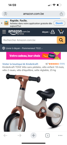 Ce produit est extrait d'une liste de cadeaux (Anniversaire, Noël, ...) déposée sur Kadolog. Kadolog permet de créer des listes de cadeaux (Anniversaire, Noël, ...) en toute liberté. Il est possible d'ajouter toutes vos envies cadeaux et de recevoir les dons directement sur votre compte. Avec les dons reçus, vous êtes alors libre d'aller acheter vos produits (comme ce 'Velo ') où et quand vous le souhaitez.