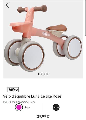 Ce produit est extrait d'une liste de cadeaux (Anniversaire, Noël, ...) déposée sur Kadolog. Kadolog permet de créer des listes de cadeaux (Anniversaire, Noël, ...) en toute liberté. Il est possible d'ajouter toutes vos envies cadeaux et de recevoir les dons directement sur votre compte. Avec les dons reçus, vous êtes alors libre d'aller acheter vos produits (comme ce ' Vélo d'équilibre Luna 1e âge Rose ') où et quand vous le souhaitez.