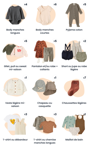 25 pièces pour le printemps/été (à chiner tous azimuts) avec des bodies, pyjamas, pulls, bonnets et des jolies tenues.
