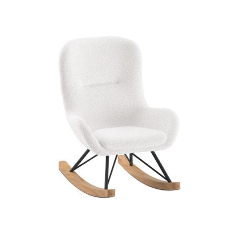 Schommelstoel Rocky heeft een metalen frame en komt in een witte bouclé-stoffen bekleding.