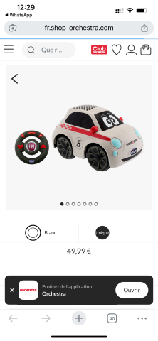 Ce produit est extrait d'une liste de cadeaux (Anniversaire, Noël, ...) déposée sur Kadolog. Kadolog permet de créer des listes de cadeaux (Anniversaire, Noël, ...) en toute liberté. Il est possible d'ajouter toutes vos envies cadeaux et de recevoir les dons directement sur votre compte. Avec les dons reçus, vous êtes alors libre d'aller acheter vos produits (comme ce ' Voiture Radiocommandée - Fiat 500 1er Age | Chicco ') où et quand vous le souhaitez.