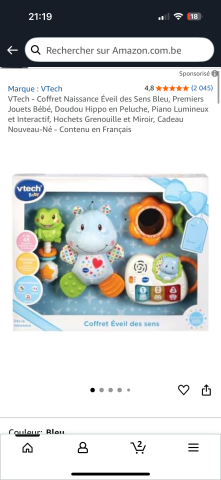 Ce produit est extrait d'une liste de naissance déposée sur Kadolog. Kadolog permet de créer des listes de naissance en toute liberté. Il est possible d'ajouter toutes vos envies cadeaux et de recevoir les dons directement sur votre compte. Avec les dons reçus, vous êtes alors libre d'aller acheter vos produits (comme ce 'VTech - Coffret Naissance Éveil des Sens Bleu, Premiers Jouets Bébé, Doudou Hippo en Peluche, Piano Lumineux et Interactif, Hochets Grenouille et Miroir, Cadeau Nouveau-Né - Contenu en Français : Amazon.com.be: Jouets ') où et quand vous le souhaitez.