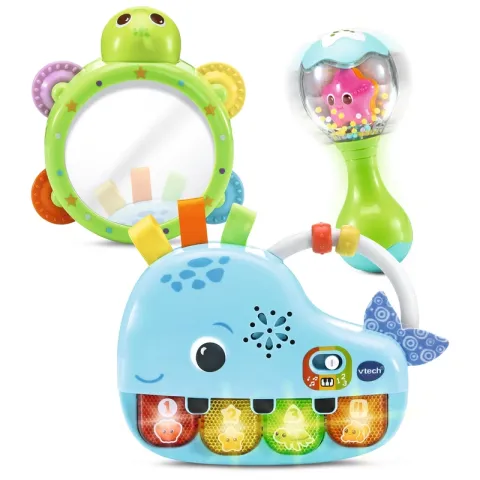 Initiez bébé à la musique grâce aux 3 instruments inclus dans le coffret : le piano baleine électronique, le tambourin tortue et la maraca étoile de mer. Le piano baleine possède 3 modes de jeu et 4 touches lumineuses pour permettre aux tout-petits de découvrir les notes de musique, de déclencher des chansons et des mélodies, mais aussi d'apprendre les chiffres. Le tambourin en forme de tortue marine joue de la musique et permet à bébé d'appréhender son reflet. La maraca déclenche des sons amusants en la secouant. Le coquillage et l'étoile de mer tournent et ainsi stimulent la vue des tout-petits.
