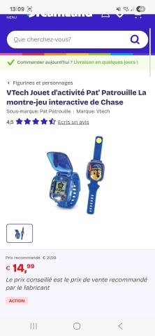 Ce produit est extrait d'une liste de cadeaux (Anniversaire, Noël, ...) déposée sur Kadolog. Kadolog permet de créer des listes de cadeaux (Anniversaire, Noël, ...) en toute liberté. Il est possible d'ajouter toutes vos envies cadeaux et de recevoir les dons directement sur votre compte. Avec les dons reçus, vous êtes alors libre d'aller acheter vos produits (comme ce 'VTech Jouet d'activité Pat' Patrouille La montre-jeu interactive de Chase ') où et quand vous le souhaitez.