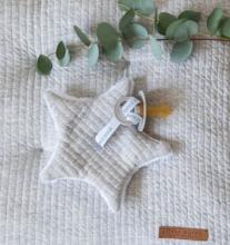 Doudou étoile ultra doux qui s’utilise parfaitement comme doudou à tétine, jouet ou doudou de consolation . Le nœud du doudou permet de fixer une tétine ou un anneau de dentition. Nous pouvons fixer une tétine ou un anneau de dentition au niveau du nœud du doudou.