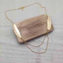 Modèle plaqué or. Les gouttes martelées contrastent avec la finesse de la chaîne et des perles de rivière. L'asymétrie rend ce modèle original.
