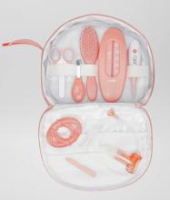- 9 accessoires essentiels pour prendre soin de bébé: un thermomètre digital avec embout souple, un mouche bébé par aspiration buccale (avec réservoir anti-retour de sécrétions), une paire de ciseaux à bout arrondi, un coupe ongle, une lime à ongle, un thermomètre de bain, une brosse douce, un anneau de dentition réfrigérable et un masseur de gencives.