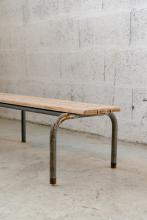 Banc en bois ou bois et acier qui va passer sa vie près de notre poêle dans la salle à manger. Si vous avez l'occasion de vous asseoir dessus vous aurez la position idéale pour saluer nos voisins pendant leur promenade tout en gardant les fesses au chaud.