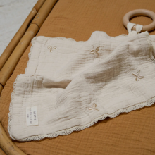 Doudou en gaze de coton brodé de trèfles et décoré d'un joli macramé avec un anneau en bois amovible (30x30cm).