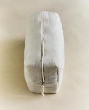Trousse de toilette pour enfant en gaze de coton, dotée d’une fermeture Éclair et ornée d’un imprimé lunes. Brodée à son nom (mystère !)