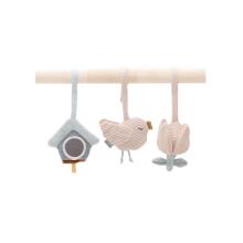 - 3 speeltjes die omhoog hangen: 1 schattig vogelhuisje, 1 vrolijke bloem en 1 lief vogeltje. - Uit superzachte stof. - Voor kindjes vanaf 10 weken! Voor de allerkleinsten is het goed dat ze gestimuleerd worden, leren observeren en ontdekken. Deze speeltjes houden hen urenlang bezig! - Speelboog apart verkrijgbaar!