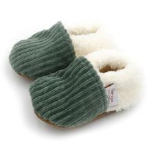Les chaussons en velours taupe fabriqués en France à la main sont parfaits pour les premiers pas de bébé !