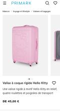 Une valise rigide à motif Hello Kitty en relief, quatre roulettes et poignées de transport