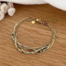 Bracelet multi-chaînes en acier inoxydable doré Composé de deux rangs de petites perles jaspe dalmatien et dorées, deux chaînes serpent et une chaîne boules Ajustable de 16 à 19cm environ Résiste à l'eau, au soleil, à la vie quotidienne... Se décline également en perles péridot et perles tourmaline