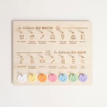 Un tableau de bois fabriqué à la main en France illustrant toutes les étapes de la routine du matin et du soir. À chaque étape réalisée, mini place un smiley coloré sur le dessin correspondant. Dimensions : 35 x 28,5 cm.