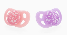 Tétine en silicone très douce, une collerette aérée pour éviter les irritations de la peau, et une forme orthodontique pour un bon développement des dents.