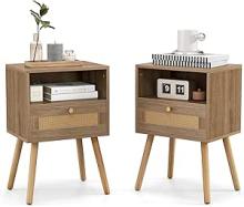 Lot de 2 Tables de Nuit en Rotin, Table de Chevet Bois avec Tiroir, 4 Pieds en Pin, Style Bohème