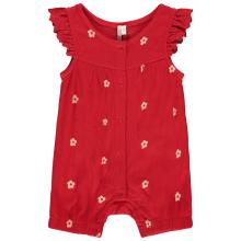 Combinaison courte en jersey. Coloris rouge. Imprimé fleurs plates contrastées all-over. Emmanchures volantées avec broderies. Encolure ronde avec ouverture pressionnée intégrale sur l'avant. Liquette pressionnée à l'entrejambe.