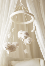 Décoration mobile pour berceau avec petits moutons et étoiles pendantes.