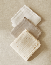 Lot de 3 gazes en coton. Modèle orné d'un imprimé lunes et étoiles sur l'une et d'un motif uni gris et beige sur les deux autres pièces.