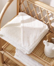 Cape de bain en coton double tissu pour bébé : gaze et éponge. Modèle à imprimé lunes et étoiles sur la capuche.