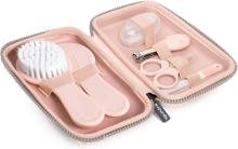 Trousse de Soin Bébé. Trousse de Toilette Complète et Transportable. Set Manucure Bébé. Contient : Brosse et peigne + Doigt Brosse à dent + Ciseaux + Lime +Coupe Ongles, 6 piéces, Rose