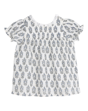 Robe à manches ballon en crépon de coton imprimé en all-over de fleurs bleues sur fond écru. L'encolure bordée par un galon de dentelle, le petit décolleté en V dans le dos, le passage de tête facilité par l'ouverture 2 boutons recouverts de tissu dans la couture d'épaule, les plis nervure sur le petit empiècement, la
