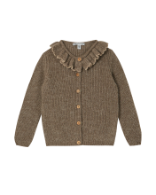 Cardigan en laine et fibres synthétiques gris. On aime l'alpaga moelleux, le tricotage en côtes 1x1 qui donne de l'élasticité, les 6 boutons en bois et la collerette de l'encolure qui est soulignée par une bordure festonnée comme des pétales de fleurs et rehaussée d'un fil de lurex doré. La principale raison de la prés