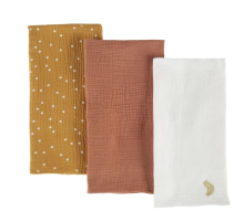 Lot de 3 langes en gaze de coton imprimé jaune moutarde, terracotta et écru