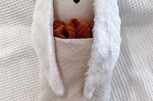 Doudou en triple gaze de coton et fausse fourrure. Il sert de couverture pour les bébés puis se transforme en doudou quand l'enfant devient plus grand.