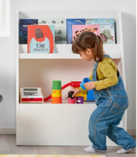 Cette bibliothèque dispose de deux tablettes et d'un large tiroir pour ranger livres et jouets. Tout est à hauteur, pour qu'il puisse s'amuser et ranger par lui-même.