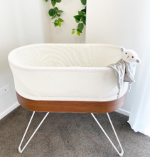 This unique baby bed uses smart technology to boost sleep (choosing slow rocking and calming white noise, like your baby enjoyed in the womb) and to calm crying (choosing just the right mix of faster rocking and stronger womb sound…just like an experienced mom or dad).
