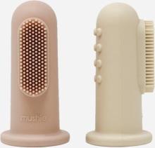 La brosse à dents Mushie est idéale pour brosser les premières dents de votre bébé. C'est une brosse à dents à doigts en silicone souple. Vous faites simplement glisser le pinceau autour de votre doigt. La brosse à dents contient de très petits poils en silicone qui sont très doux et qui «massent» les gencives et nettoient les dents.
