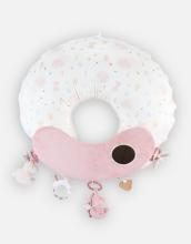En position d’éveil, couché sur le ventre, bébé est encouragé à lever la tête, stimulé par les différents jouets à sa portée. Les jouets colorés aux formes différentes stimuleront sa vue, son ouïe, le toucher.
