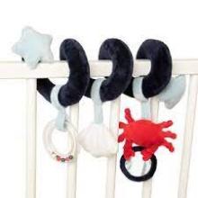 Une spirale d'activités participe à l'éveil de bébé. Sa forme lui permet de s'enrouler facilement autour d'un lit, d'un parc, d'une poussette ou encore d'un couffin. Spirale d'activités avec étoiles, anneau à billes, coquillage, miroir et crabe.