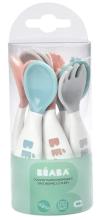BÉABA, Set Premiers Couverts ergonomiques, Lot de 6 Cuillères & 4 Fourchettes, Manche court et arrondis, Prise en main facile pour Bébé, Adaptée aux droitiers et aux gauchers, Gris/Bleu/Rose