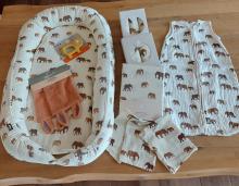 Nid de bébé, gigoteuse été 0-3 mois, gants de toilette, tétras moyens et grands, draps de lit, et un jeu trixie