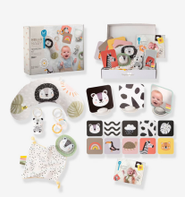 Ce petit livre d’activités doux est spécialement conçu pour stimuler les sens de votre bébé. Il se compose de quatre pages, chacune illustrée d’un adorable animal : un lapin, un oiseau, un canard ou un cygne. Les pages sont remplies de matières bruissantes qui invitent à la découverte et au jeu. Un petit miroir et des