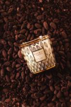 Available in small format, the Pérou scented candle pays tribute, through its screen-printed design, to criollo beans harvested exclusively in Peru, recognizable by their unique whiteness that gives Pérou dark chocolate the appearance of milk chocolate. A rain of white and gold beans is scattered across the glass, creating a highly decorative and precious effect. In its whiteness, this pattern echoes the very structure of these exceptional beans.