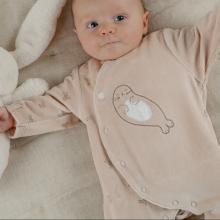 Pyjama bébé écru en velours (280 g/m²) avec broderie phoques : ouverture frontale, chevilles élastiquées, attache doudou, Oeko-Tex. Lavable 30°C.