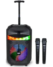 Puissance 220 W. Entrée USB, bluetooth, télécommande, radio, fonctions écho et priorité micromicro SD et USB type-C (câble inclus). 2 micros sans fil inclus. Batterie rechargeable.