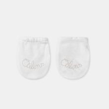 Gants de naissance à côtes en coton issu de l'agriculture biologique. Inscription "Câlins" de couleur beige foncé sur fond écru.