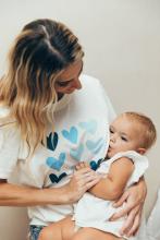 T-shirt d'allaitement coeurs bleu imprimé avec zips d'ouvertures sur les coté pour un allaitement facile.