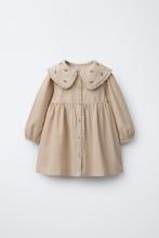 Robe avec col claudine avec détail fleurs brodées et manches longues finies par un élastique. Fermeture boutonnée sur le devant.