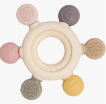Ce hochet aidera à soulager les douleurs de dentition de bébé grâce aux différentes textures et formes de la partie en silicone.